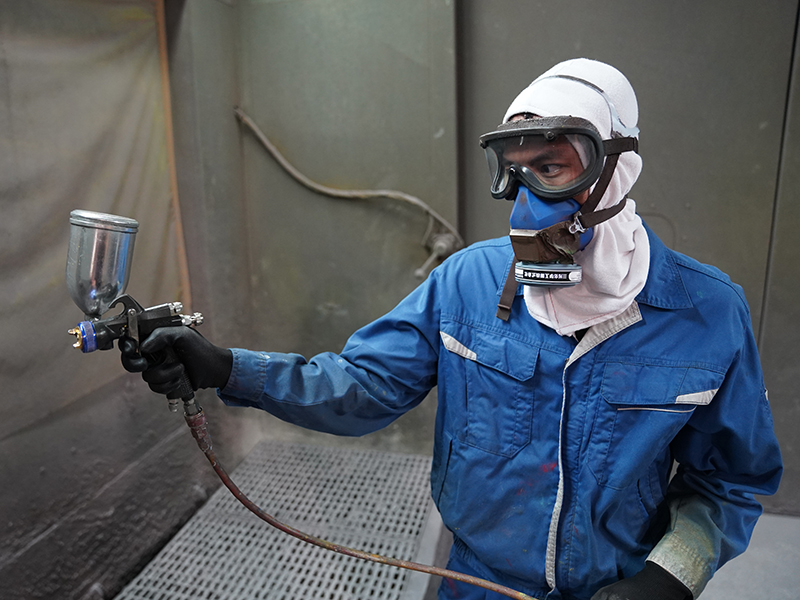 下塗りされた部品の仕上げ塗装を行う工程。