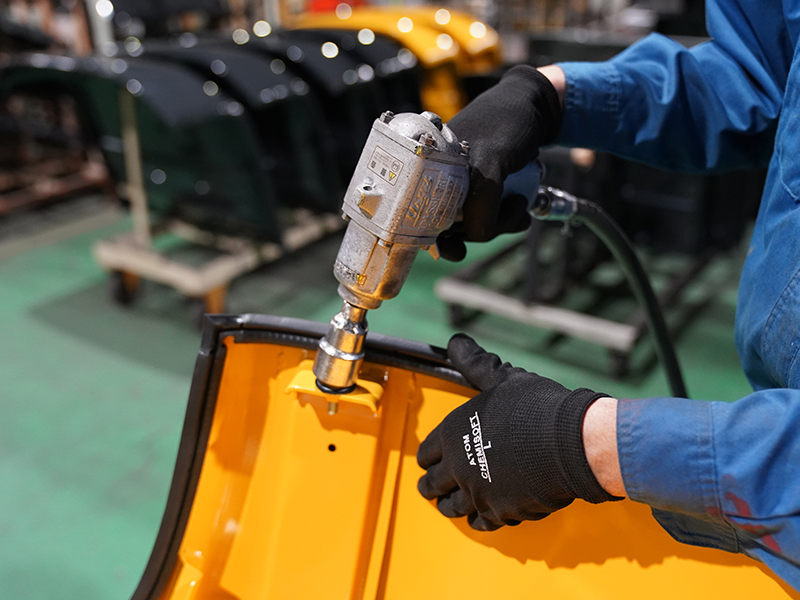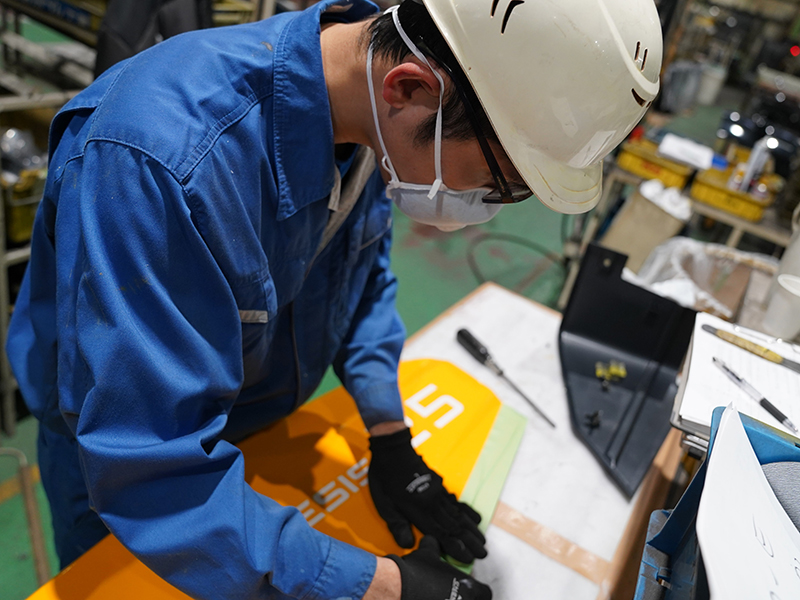 塗装された部品にゴムやスポンジなどのパーツを取り付ける工程。